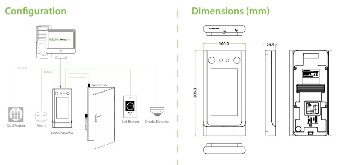 Với công nghệ Visible Light, thiết bị có khả năng nhận dạng khuôn mặt ngay cả trong điều kiện ánh sáng và khả năng thu phóng góc rộng. SpeedFace M2 cho phép nhận dạng chính xác trong khoảng cách 1-2m.